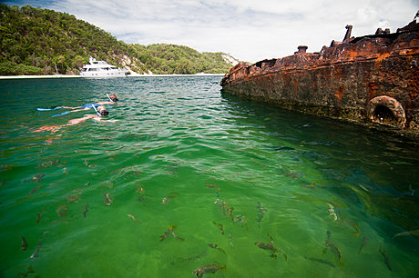 Next, enjoy a beach walk and explore the Dolphin Research Centre, then go for a swim and relax for a while. Lunch and cold drinks are included for your enjoyment while looking at the Tangalooma Shipwrecks, Glasshouse Mountains, and Moreton Bay Marine Park. You can get up close and personal with the shipwrecks and the rich marine life on a guided adventure snorkel tour. Moreton Bay is home to an abundant variety of marine life, including turtles, dolphins and dugongs, as well as many colourful species of tropical fish. All equipment is provided for your adventure snorkel, after which you can relax and head home on the luxury ferry after an action-packed full day on Moreton Island.