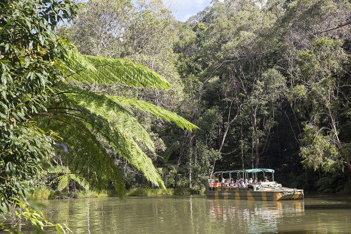 Wander through the tropical Fruit Orchard featuring over 40 local and international exotic fruit trees. Glide over the rainforest canopy aboard Skyrail Rainforest Cableway, with stops at Red Peak and Barron Falls stations.